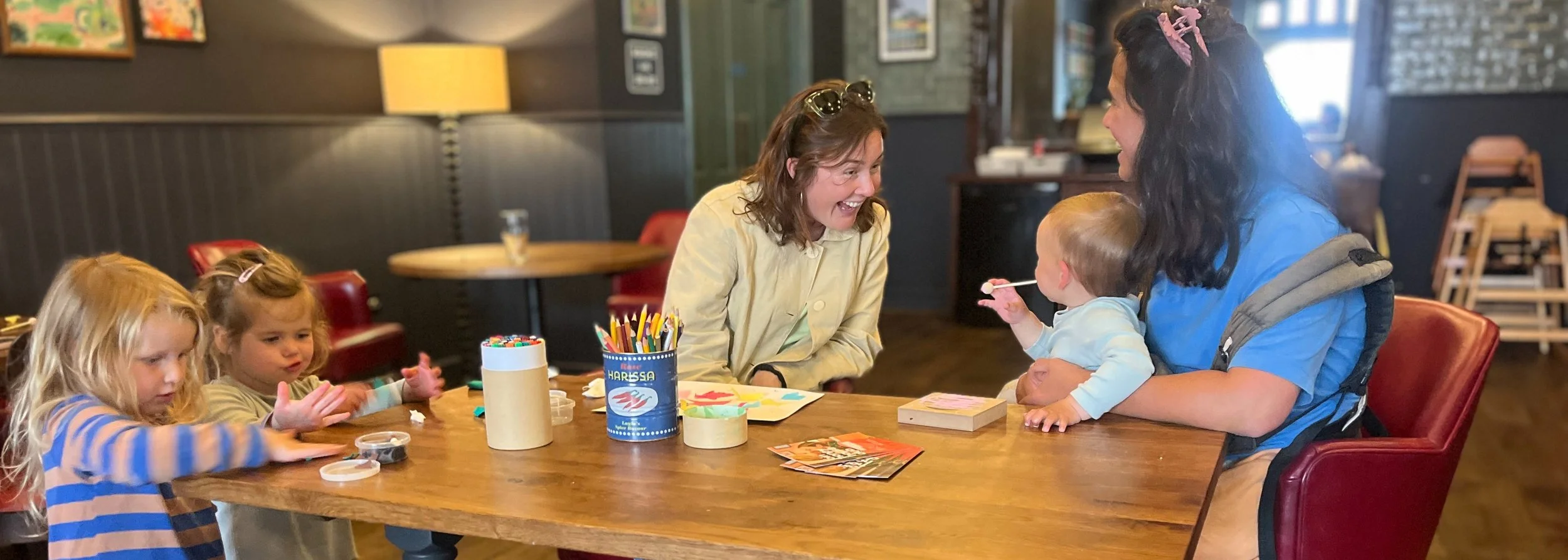 Expect simple crafts, building blocks, colouring and games for the kids - and some glorious co-parenting, chatting and creating for the adults.